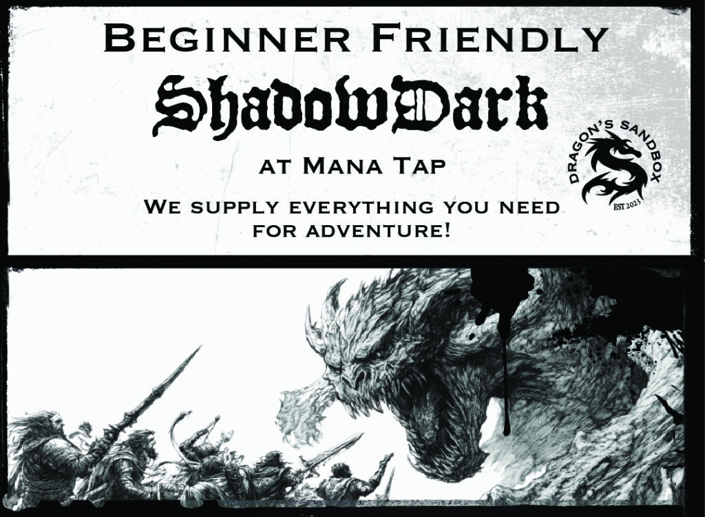 Join GM Erik Frankhouse as he hosts a beginner friendly table of Shadowdark at Mana Tap. “Shadowdark is what an old-school fantasy adventure game would look like after being redesigned